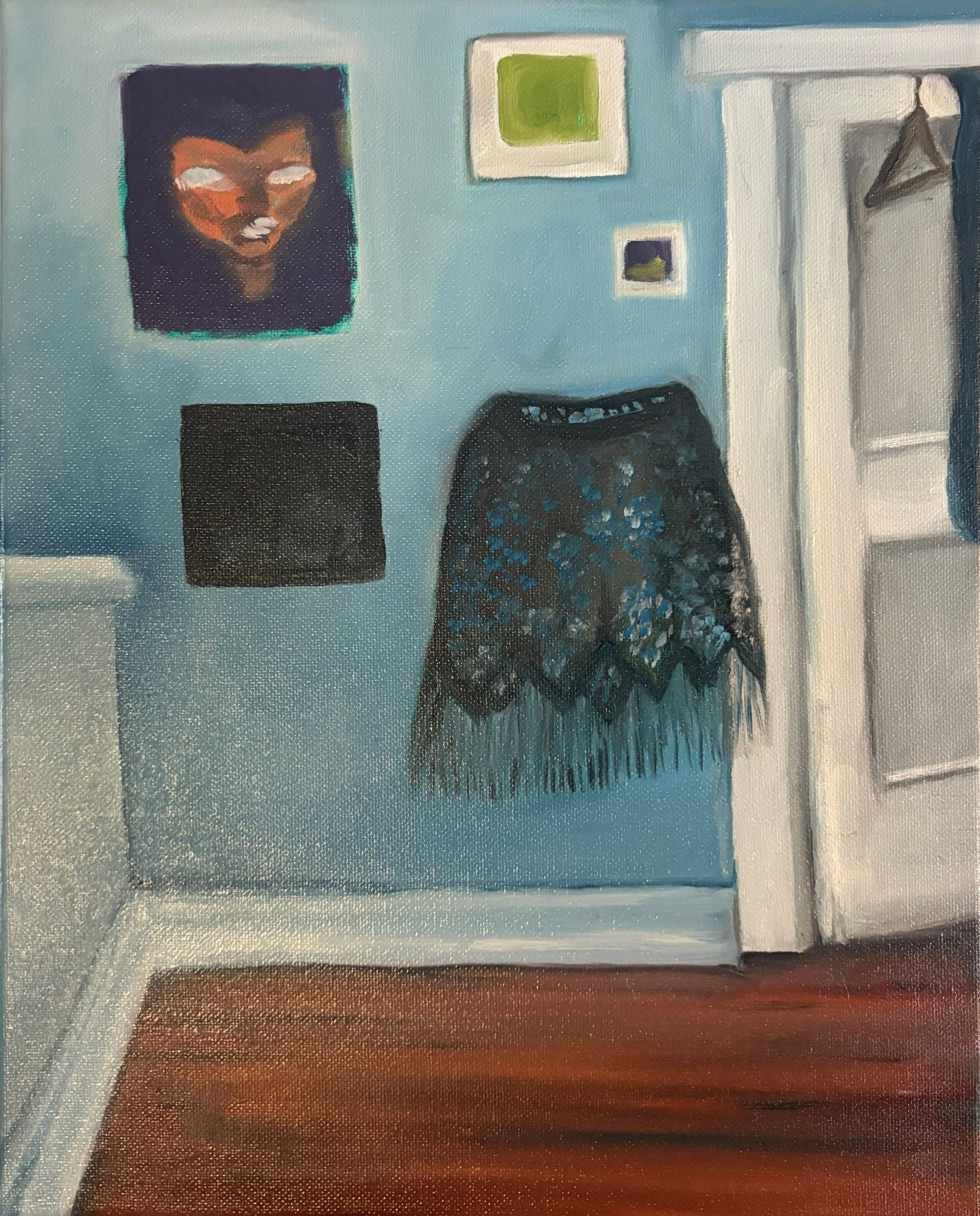 This is my first “still life” painting that stems from real life. I look at this view of a corner in my bedroom everyday. I have been challenging myself to paint it with relatively few reference checks, trying to rely on my memory to smooth my brush strokes.